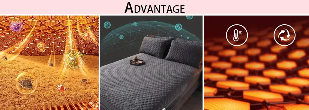 Antibacterial at pag-aalis ng mite: Ang mga materyales ng graphene ay epektibong makakapigil sa paglaki ng bacteria, nakakapagbigay ng malakas na kapasidad ng adsorption, nakakasipsip ng mga amoy, at nakakatamasa ng sariwa at malinis na kapaligiran. Mas mahusay na protektahan ang ating balat at maiwasan ang mga problema sa balat na dulot ng pag-aanak ng mites at bacteria.