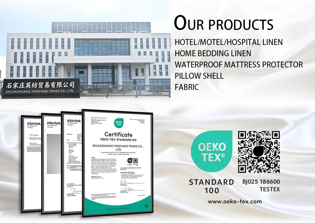 Kami SHIJIAZHUANG YINGFANG TRADE CO.,LTD malawak na hanay ng produktong Tela ay kinabibilangan ng: mataas na kalidad na puti at vat dye colored bed sheets, fitted sheet at pillowKasos, quilts, white satin striped & printed quilt covers, blanket, unan, waterproof mattress at pillow protector, quilted mattress na pang-ibabaw na kutson, kutson na pang-ibaba ng tubig shell, takip, apron, accessories at iba pa na pangunahing ginagamit para sa ospital, hoTel, at tahanan.